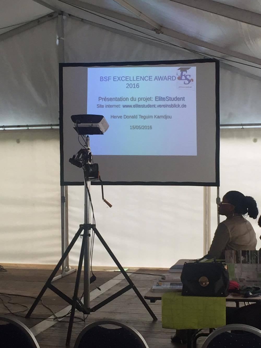 En date du Dimanche 15 Mai 2016, nous avons eu le plaisir de présenter officiellement le projet „EliteStudent“ lors du concours „Excellence Award“ organisé par le Business Social Forum Challenge Camerounais 2016; ceci devant un public venu très nombreux. Ce fût l´occasion pour nous de parler de ce projet, ses objectifs, ses motivations, les projets futurs etc.