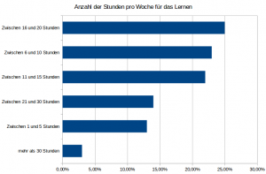 Etudier ses leçons afin de produire une bonne performance au cours des examens est très important. Ainsi, nous avons voulu évaluer le nombre d´heures que les personnes interrogées accordaient à leurs études pendant la semaine: ainsi, la majorité des étudiants accorde entre 16-20h de temps pour leur études pendant la semaine. Environ 14% des personnes fournissent un effort considérable en consacrant plus de 20h de leur temps pour les études. Le plus impressionant est que 3% vont au-delà des 30h. En moyenne les étudiants accordent entre 11 et 15h de temps par semaine pour étudier les cours.