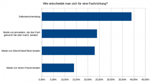 Parmi les personnes interrogées soit environ 24% affirment avoir été encouragés par un parent à choisir leur filière. 14% ont été encouragés par un ami, 23% ont été motivés par un grand frère ayant auparavant fait leur filière. Des 221 personnes questionnées un peu moins de 40% revèlent avoir choisi leur filière par initiative personnelle.