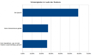 Relativement aux difficultés recontrées par les étudiants au cours de leurs études, un peu plus de 59% affirment avoir eu des sérieuses difficultés au niveau de la langue. Plus de 27% des personnes affirment avoir dû faire face à un gros problème de connaissance préalables (Vorkenntnisse) lié à leur filiere qu´ils ne possédaient pas au début des études. Environ 26% avouent avoir eu cette meme difficulté en ce qui concerne les (stages préparatoires) Vorpraktikum. Des difficultés ou problemes d´autre genre ont aussi été notés tels que: la discrimination, l´intégration, l´organisation, des problemes financiers. L´étude menée afin de savoir s´il existe un rapport corrélatif entre ces difficultés et la durée qu´une personne met jusqu´à la fin des études revèle que ces problemes constituent un grand frein dans la progression normale d´un étudiant.