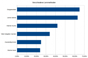 Analyse des techniques de révision utilisées par les étudiants. Durant l´enquète, il a été demandé aux personnes d´énumérer les techniques d´etudes qu´elles utilisaient ou favorisaient le plus. Ainsi, environ 63% mettent plus d´accent sur le travail seul, 65% privilégient aussi le travail en groupe. La technique d´apprentissage par coeur n´est pas trop préférée par les étudiants, car juste un peu plus de 25% s´attele à etudier par coeur. De meme que l´apprentissage par coeur, la lecture de livres est tres peu appreciée par les étudiants. Ceci est justifiée par le fait qu´environ 24% observent cette technique. Environ 34% préfèrent faire beaucoup d´exercices, ce qui constitue leur technique de base. En ce qui concerne la recherche sur internet, 42% avouent tres souvent travailler avec internet.